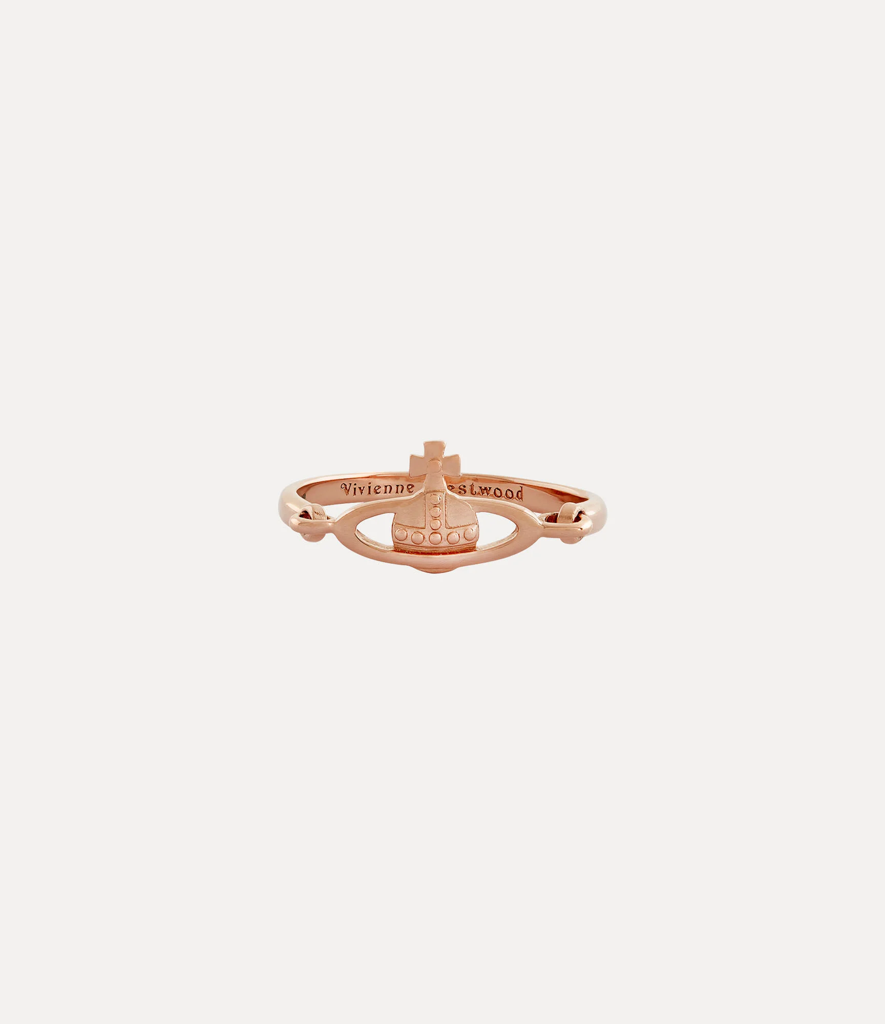 Our Vendome ring in pink-gold tone sterling silver features a delicate banded design, complete with a cut out orb motif on the face that is able to rotate on its hinges - synonymous with Vivienne's vision of taking tradition into the future. To finish, the piece is inscribed with our house's signature typography motif on the inner side. Code: 64040011-01G002-SM-PINK-GOLD-925- - Features cut-out detailing - Orb-shaped face - Thin-band design - Bead detailing - Engraved inner - Weight: 1.12g - Orb height 1.4cm, orb width 1.4cm COMPOSITION - 100% Recycled silver