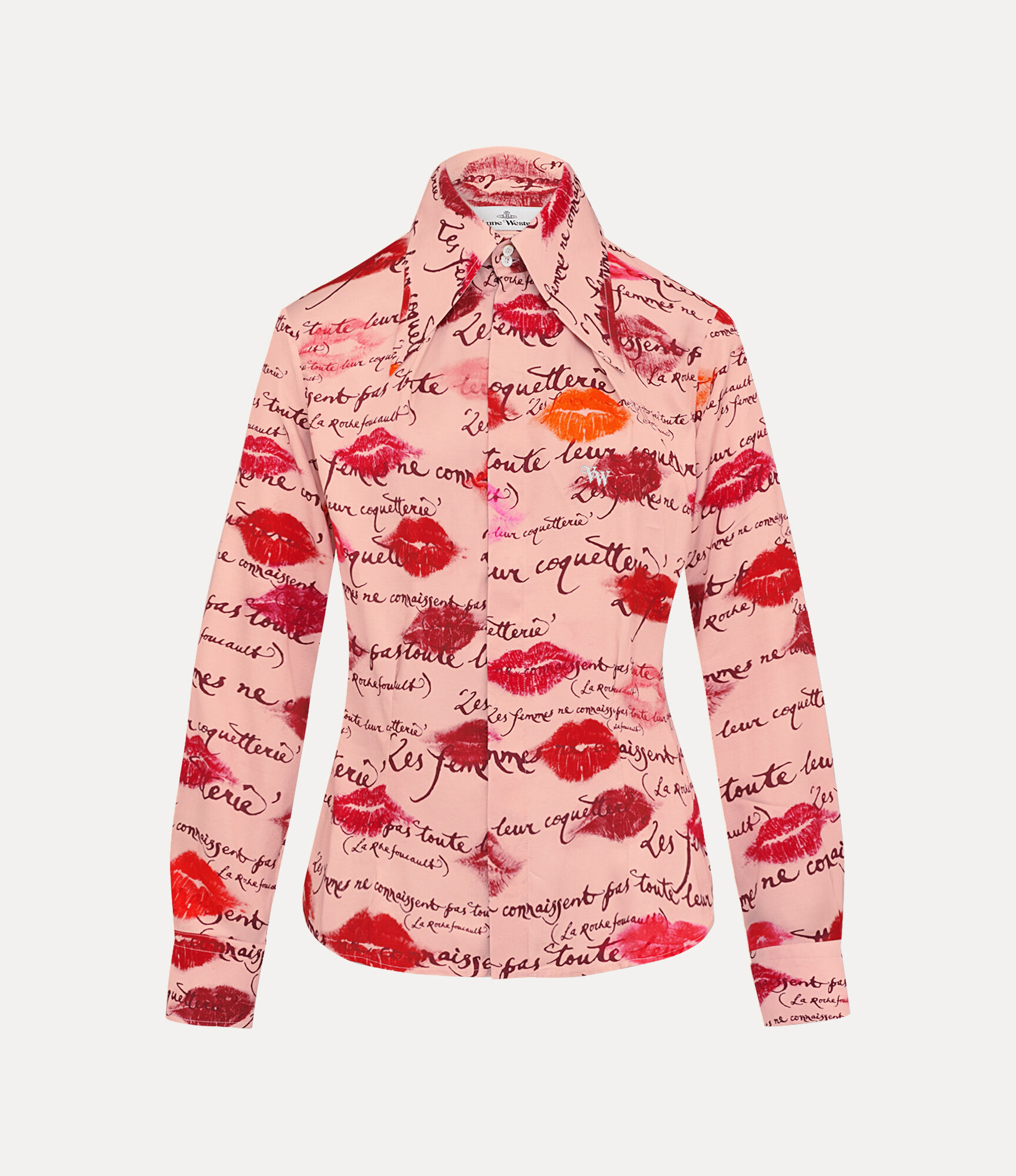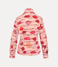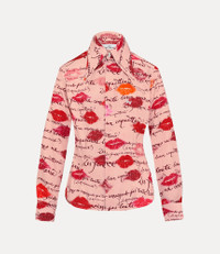 Our Violin Tuxedo shirt features the house's signature two-button collar, adorned with the ‘Kisses’ artwork, inspired by our 'Boudoir' perfume packaging. The piece offers an exaggerated pointed collar, finished with delicate darting at the bust and waist for a sculpted, contoured shape. Code: 1501006A-W017G--KISSES - Features Vivienne's hand-written ‘Les Femmes Ne Connaissent Pas Toute Leur Coquetterie’ artwork - Gently rounded hem - Engraved amber buttons - Concealed button placket - Fitted silhouette - Long sleeves - Structured cuffs - Darted construction - Refined and understated seams - The model is 5'11/180cm and is wearing a size 40 COMPOSITION - 100% Viscose - Viscose derived from wood pulp sourced from forests managed in accordance with certified forestry standards.