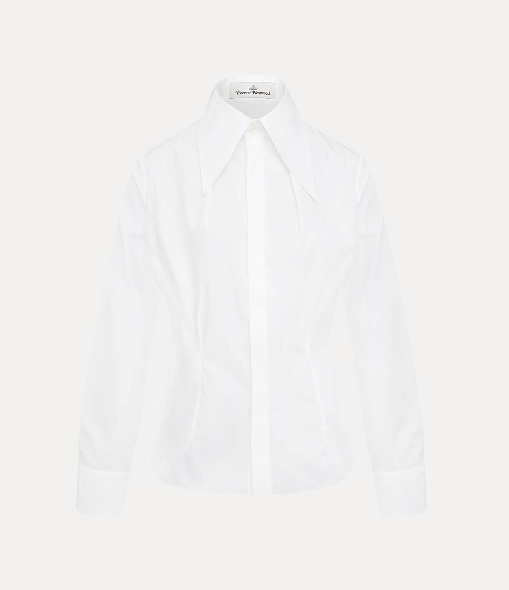 Our Violin Tuxedo shirt features the house's signature two-button collar, complete with our signature 'VW' monogram embroidery on the left-hand side of the chest. Crafted from soft organic cotton, the piece offers an exaggerated pointed collar, finished with delicate darting at the bust and waist for a sculpted, contoured shape. Code: 1501006A-W009Q--WHITE - Features a gently rounded hem - Engraved amber buttons - Concealed button placket - Fitted silhouette - Long sleeves - Structured cuffs - Darted construction - Refined and understated seams - The model is 5'11/180cm and is wearing a size 40 COMPOSITION - 100% Organic cotton - Organic fibres are natural fibres grown with strict rules concerning the use of synthetic pesticides, insecticides, or herbicides and GMOs (Genetic Modified Organisms).