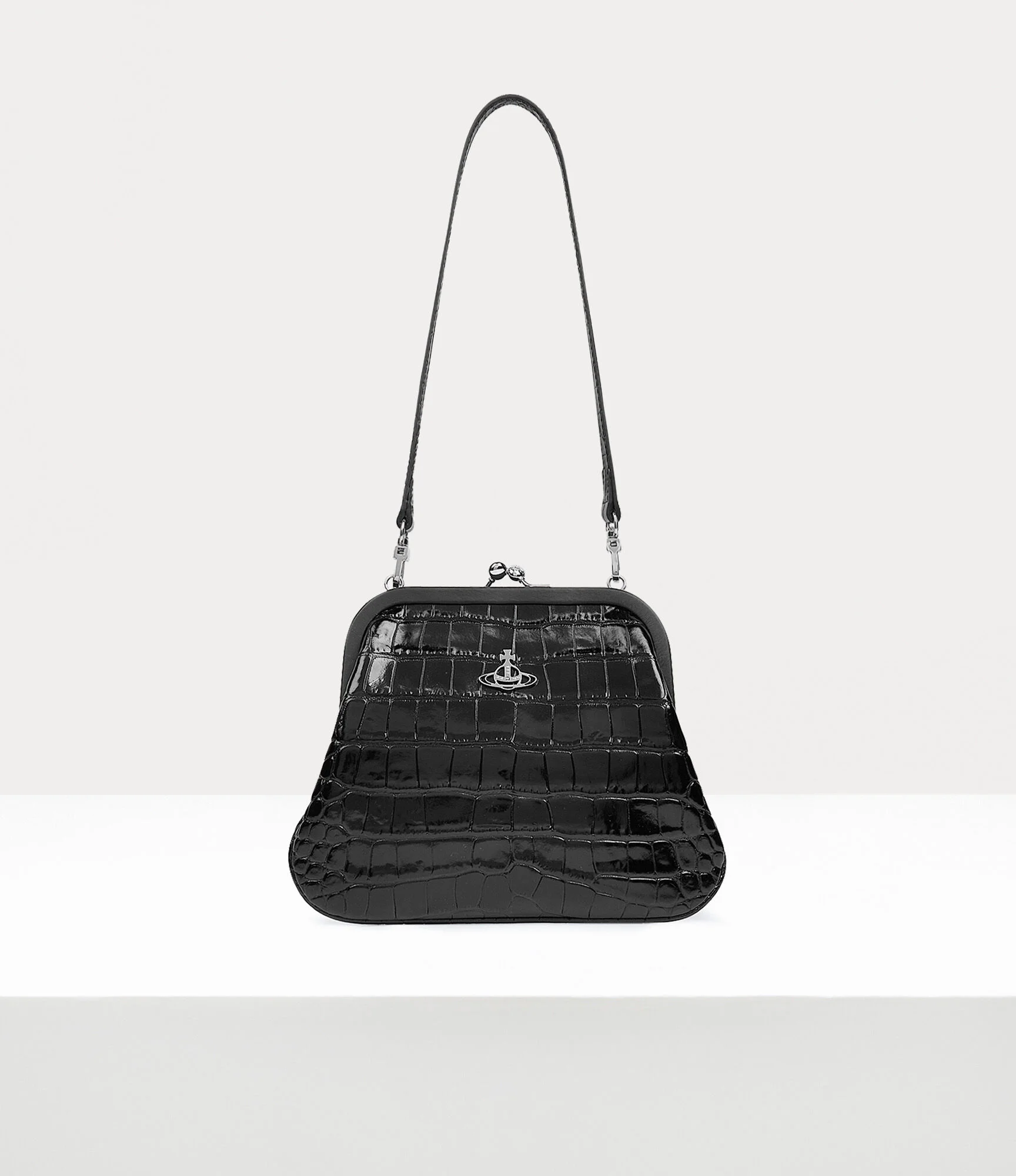 The leather Vivienne's clutch pays homage to our brand's founder. This classic style features a vintage-like kiss-lock frame and a polished orb motif, embodying Vivienne Westwood's vision of blending the past with the future. Code: 8050889708483 - Patent finish - Removable strap - Croc-embossed texture - Orb stud - Ball-clasp fastening - Embossed inner tab - Measurements: height 18cm, width 23cm, depth 4cm COMPOSITION - 100% Calf leather - Interior lining: 68% recycled cotton, 32% cotton - The leather used has been awarded against the LWG Environmental Auditing standards designed to provide a measure of compliance and performance capabilities of the leather business.