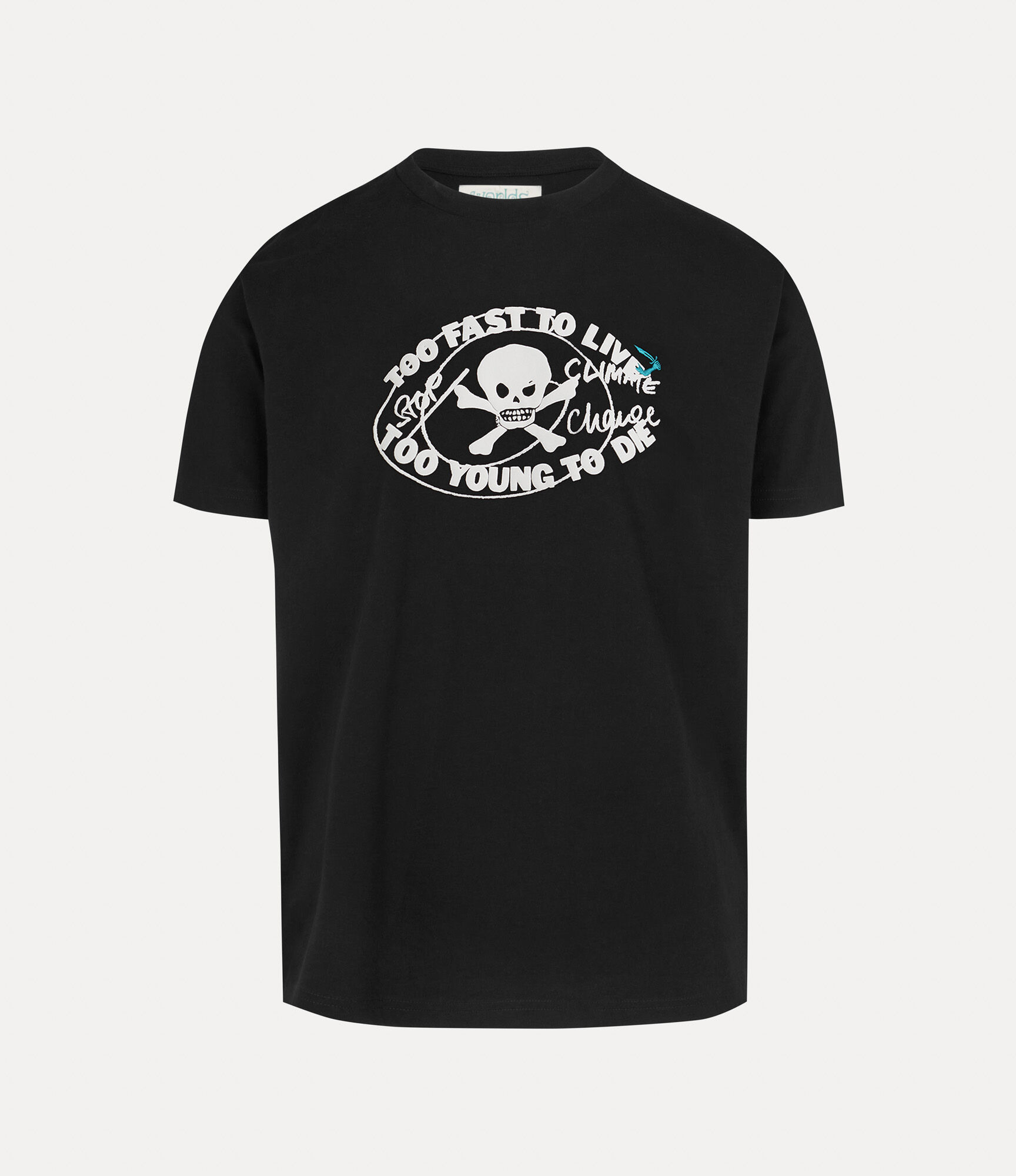Our Worlds End Classic t-shirt is crafted from lightweight cotton, shaped with a crew neckline, short sleeves, and a straight hem. The design is complete with the “Too Fast to Live, Too Young to Die” slogan, taken from the signage of our iconic boutique, now known as Worlds’ End. Code: 3G01003K-J001M--BLACK - Features ribbed trims - Step-hem silhouette - Arm and cutlass motif - Short sleeves - Round neckline - Tonal stitching - Lightweight design - Non-stretch fabric COMPOSITION - 100% Cotton