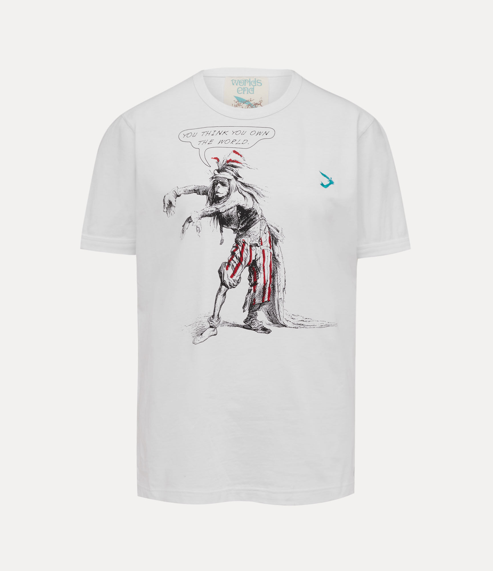Our Worlds End Classic t-shirt is crafted from soft cotton, featuring short sleeves and a round neckline. The piece is adorned with the archive 'Arm and Cutlass' embroidery on the chest and the 'Own The World' artwork, a design from Vivienne’s playing cards that illustrates a culture-led economic strategy to save the world, urging us to reflect on our role in shaping the future. Code: 3G01002U-J001M--WHITE - Features ribbed trims - Fits true to size, please take your normal size - Straight hemline - Tonal stitching - Lightweight - Non-stretch fabric COMPOSITION - 100% Cotton