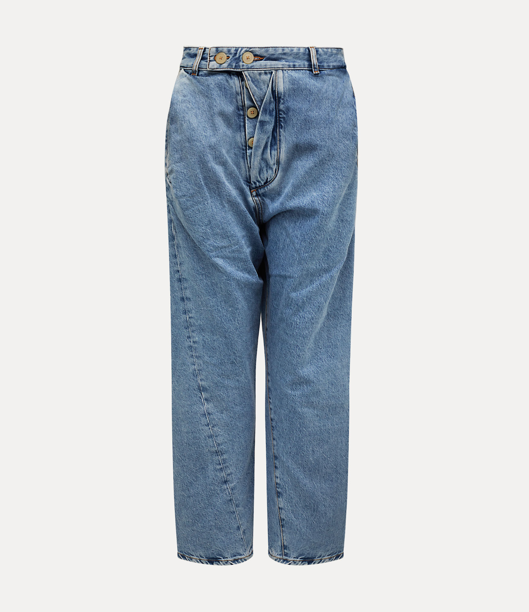 The World's End Drunken trousers, in a light denim wash, feature the house's signature drunken system, which draws from traditional British tailoring with a twisted, skewed approach to cutting. The trousers are defined by an asymmetric front closure, creating a distorted, draped effect that embodies the house's punk aesthetic. Code: 3902000S-W010C--BLUE - Features an asymmetric button fly fastening - Two waist button tabs - Dropped crotch - Two slit pockets - Belt loops - 'Arms and Cutlass' embroidery on the rear pockets - Warped seams COMPOSITION - 100% Cotton