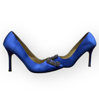 Manolo Blahnik Hangisi 90 Blue satin almond toe pumps featuring a square crystal buckle encased in a gunmetal frame. Finished with a stiletto high heel. Upper: 68% viscose, 32% silk. Sole: 100% cow leather. Lining: 100% goat skin. Heel measures 90 mm. Italian sizing. Made in Italy. Original box not included PLEASE CHECK ACTUAL SIZE CAREFULLY, NO RETURNS OR COMPLAIN FOR WRONG SIZE ACTUAL *Shipping using Express Mail Service “will take 4 - 7 working day to arrived at your destination” Dont forget to check my other item -THANKS FOR YOUR VISIT-