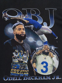 Los Angeles Rams Odell Beckham Jr Rap tee Large frame Armpit to armpit: 22 Shoulder to length: 28.5 Excellent Condition 9/10 Good Fade We accept PAYPAL only. We accept WORLDWIDE SHIPPING. Shipping: DHL EXPRESS SHIPPING Estimated: (1-6 days delivery time depend on location ) Please check all pictures & ask questions for any Additional info before purchase. Some Items are USED, VINTAGE & PRELOVE items. Donts Expect it to be like NEW condition. Pls give your phone number after purchase. Very low express shipping all over the world. Don't forget to check out my store for more great stuff. Thank you so much for your visit!!