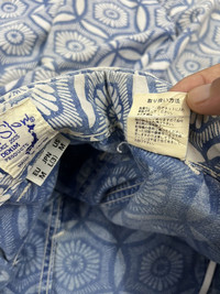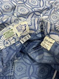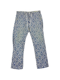 Some faded color on thighs and hips. Material from cotton and hemp Measurements in inch Waist - 34 (adjustable drawstring) Rise - 14 Thigh - 12.5 Knee - 9 Leg opening - 7.5 Inseam - 27 Outseam - 38