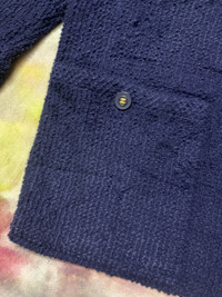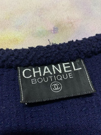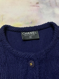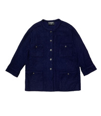 Rare CHANEL BOUTIQUE navy blue tweed jacket. Featuring a collarless design, a front button fastening, patch pockets and iconic CC button. Overall good vintage condition. Size tag removed. Label missing. Sizes is vary, so please refer measurement and compare. All sales are final. No return. No refund
