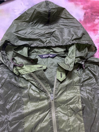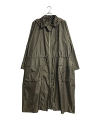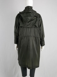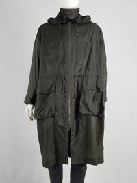 Issey Miyake Windcoat green foldable parka with multiple pockets — 1990s Size: N/A (fits M-L) Composition: 100% nylon Details: Khaki green parka Extremely oversized Detachable hood with drawstrings Two large front pockets with flap Oversized breast pocket with sideways slit Drawstring waist Front zipper closure Straps with buttons to fasten the cuffs Large pocket on the back with zipper closure, meant to fold the parka into itself Transforms into a handy carry-on bag Windcoat line, for rainy weather