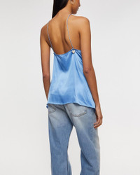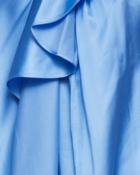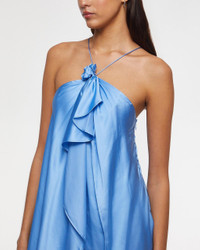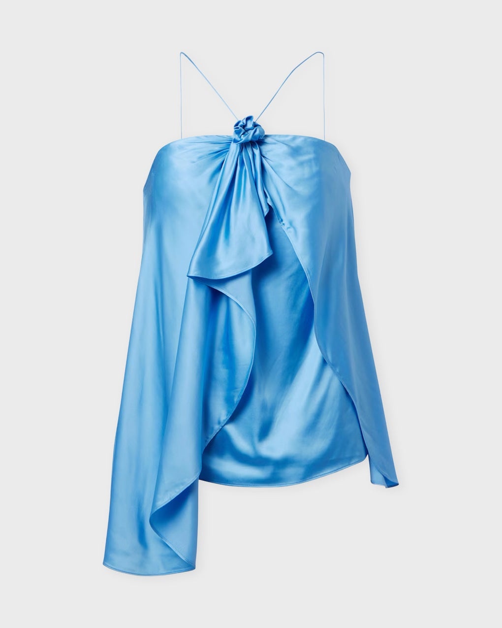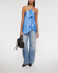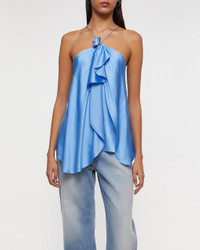 Satin Halter Blouse from Acne Studios. A trendy halter-neck blouse crafted from a fluid satin fabric that delivers a soft, luxurious feel. It features a flattering regular fit with draped ruffle details at the front for graceful movement. The shoulder straps are adorned with a silver-tone heart charm stamped with the Acne Studios logo. Size and Fit - Fits true to size, choose your usual size - The model is 177 cm tall and is wearing size 36 Specification - Article number - ID: 176378-022 - Brand: Acne Studios - Color: Blue - Washing Instructions: Dry clean - Made of: 51% Viscose, 46% preferred viscose, 3% elastane