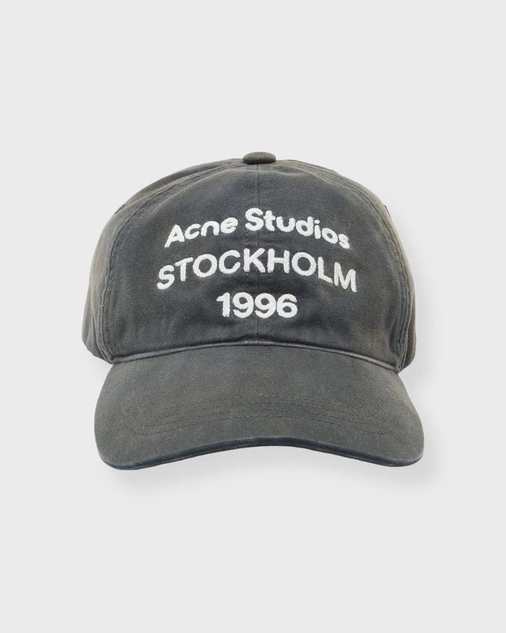 Cap Logo from Acne Studios. A refined take on the classic baseball cap, defined by an embroidered Acne Studios 1996 logo at the centre front. Crafted from soft peached organic cotton twill, it features a curved brim and an adjustable D-ring closure for a tailored fit. An effortless finishing touch to any modern look. Details: Six-panel design, embroidered logo, adjustable D-ring closure. Material: 100% organically grown cotton. Specification - Article number - ID: 177726-425 - Brand: Acne Studios - Color: Faded black - Color: Black