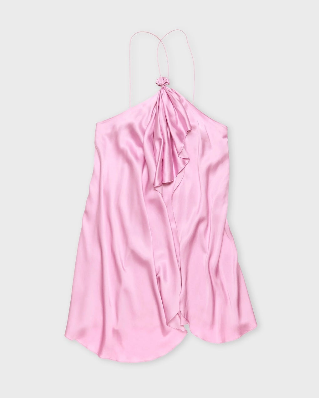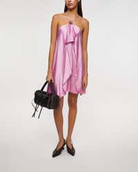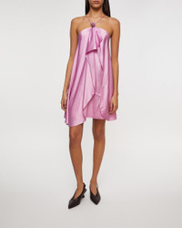 Dress Halter Satin from Acne Studios. An elegant halterneck dress crafted from a fluid satin fabric, offering a soft and luxurious feel. The dress features a flattering regular fit with an above-the-knee length and is adorned with draped ruffle detailing at the front, creating movement and elegance. The straps are finished with a silver-toned heart charm featuring the Acne Studios logo, adding a subtle, exclusive touch. Perfect as a party dress or summer dress for all of the season’s celebrations. Size and Fit - Fits true to size, choose your usual size - The model is 177 cm tall and is wearing size 36 Specification - Article number - ID: 176380-045 - Brand: Acne Studios - Color: Blush - Washing Instructions: Dry clean - Made of: 51% Viscose, 46% Preferred viscose, 3% Elastane