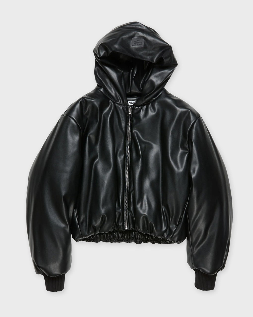 Hooded Faux Leather Jacket from Acne Studios. Crafted from faux leather with a grained finish and soft touch, this hooded jacket features an elasticated hem for a gathered effect, side-seam pockets, ribbed cuffs, and a metal logo plaque on the hood. Cut to a regular fit. Size and Fit - Fits true to size, choose your usual size - The model is 177 cm tall and is wearing size 36 Specification - Article number - ID: 176607-000 - Brand: Acne Studios - Color: Black - Washing Instructions: Dry clean - Made of: 100% Polyester, Coating: 100% Polyurethane