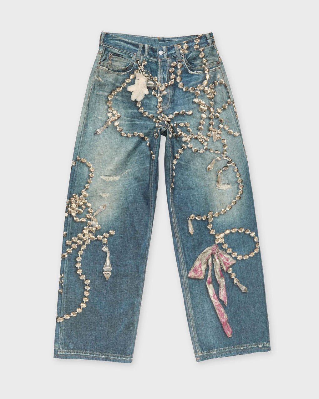 Jeans 1981 Loose Fit from Acne Studios. Jeans featuring a seasonal trompe-l’œil print of crystals and bows, crafted from denim with a brushed finish for a soft handfeel. The 1981 jeans are cut to a loose fit with a low to mid waist, super baggy leg, and long length. Finished with a classic 5-pocket construction. Unisex jeans are designed to sit low on the waist – for a higher rise, we recommend selecting one size down. Size and Fit - Runs large in size, choose one size smaller than usual - The model is 176 cm tall and is wearing size XS Specification - Article number - ID: 177273-900 - Brand: Acne Studios - Color: Mid blue - Washing Instructions: Dry clean - Made of: 100% Cotton