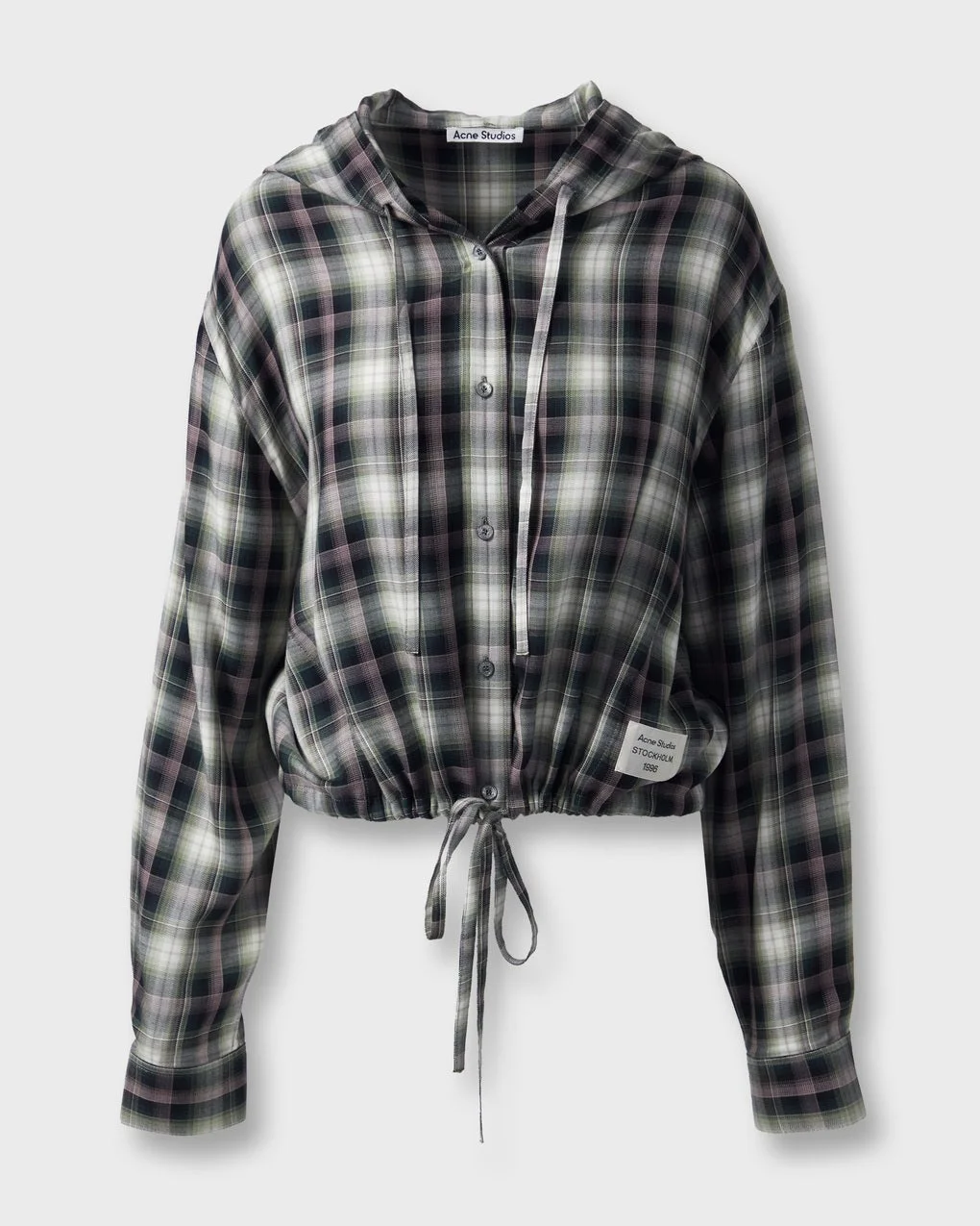 Shirt Hooded Check from Acne Studios. This hooded overshirt jacket features a flannel check pattern and a branded logo tab at the front. Designed with a centre-front button closure and classic shirt cuffs, it is finished with adjustable drawcords at the hood and hem, as well as discreet side-seam pockets. Cut to a relaxed silhouette that falls at the hip. Size and Fit - Fits true to size, choose your usual size - The model is 175 cm tall and is wearing size 36 Specification - Article number - ID: 177735-321 - Brand: Acne Studios - Color: Svart/gron - Washing Instructions: Gentle machine cycle at 30° - Made of: 100% Viscose
