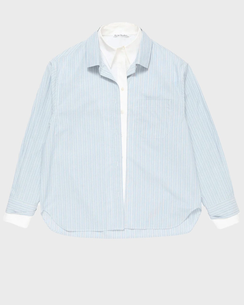 Soublera Striped Shirt by Acne Studios. This button-up shirt features a double-layered construction with a contrasting white underlayer and a striped overlayer. Made from classic shirting fabric, it reveals underlayer details at the collar and cuffs, adding a modern twist to a timeless design. The shirt includes a chest pocket and is cut in a regular fit with a hip-length silhouette, a stylish update to a classic piece. Size and Fit - Fits true to size, choose your usual size Specification - Article number - ID: 176594-262 - Brand: Acne Studios - Color: Blue/White - Washing Instructions: Machine wash - Made of: 100% Cotton