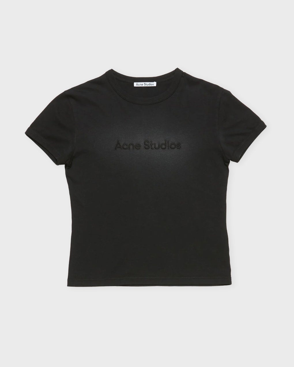 Logo Fitted T-Shirt from Acne Studios. A trendy crew neck T-shirt crafted from soft jersey cotton, detailed with an Acne Studios logo and a sprayed fade-out effect. Designed with a fitted silhouette. Made from 100% organic cotton. This product belongs to the W Sustain category as it is made from sustainable materials. Size and Fit - Fits true to size, choose your usual size - The model is 175 cm tall and is wearing size S Specification - Article number - ID: 175313-425 - Brand: Acne Studios - Color: Faded black - Washing Instructions: Handwash - Made of: 100% Organic Cotton