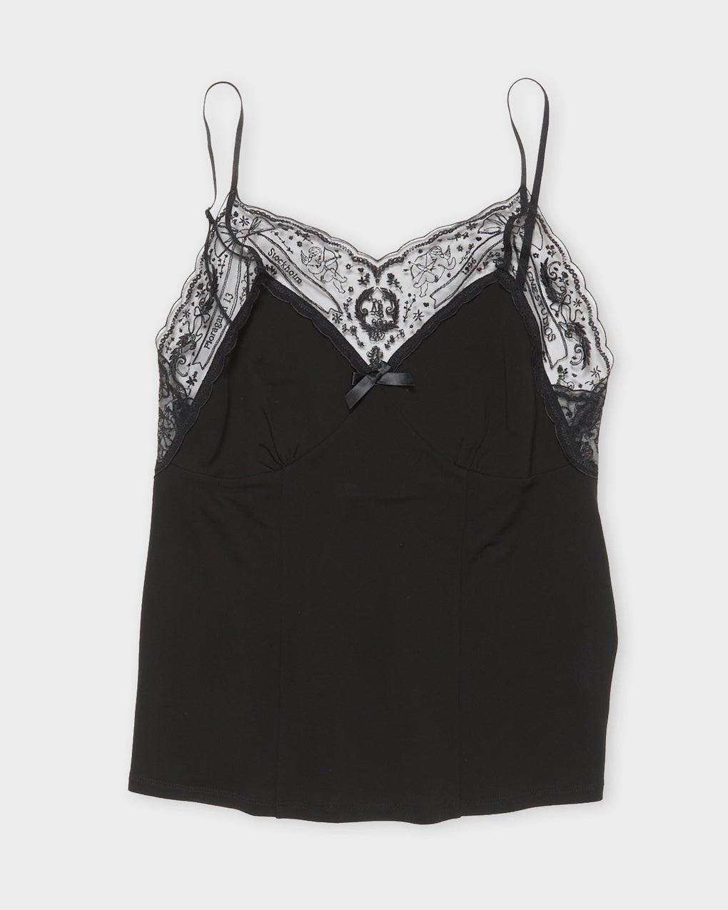 Top Camisole Crepe Jersey from Acne Studios. A trendy camisole designed for a relaxed fit. The top features thin, adjustable shoulder straps and is adorned with lace details showcasing a unique "Acne Studios" motif, along with a bow at the front. Size and Fit - Fits true to size, choose your usual size - The model is 172 cm tall and is wearing size 36 Specification - Article number - ID: 176579-000 - Brand: Acne Studios - Color: Black - Washing Instructions: Dry clean - Made of: 100% Viscose