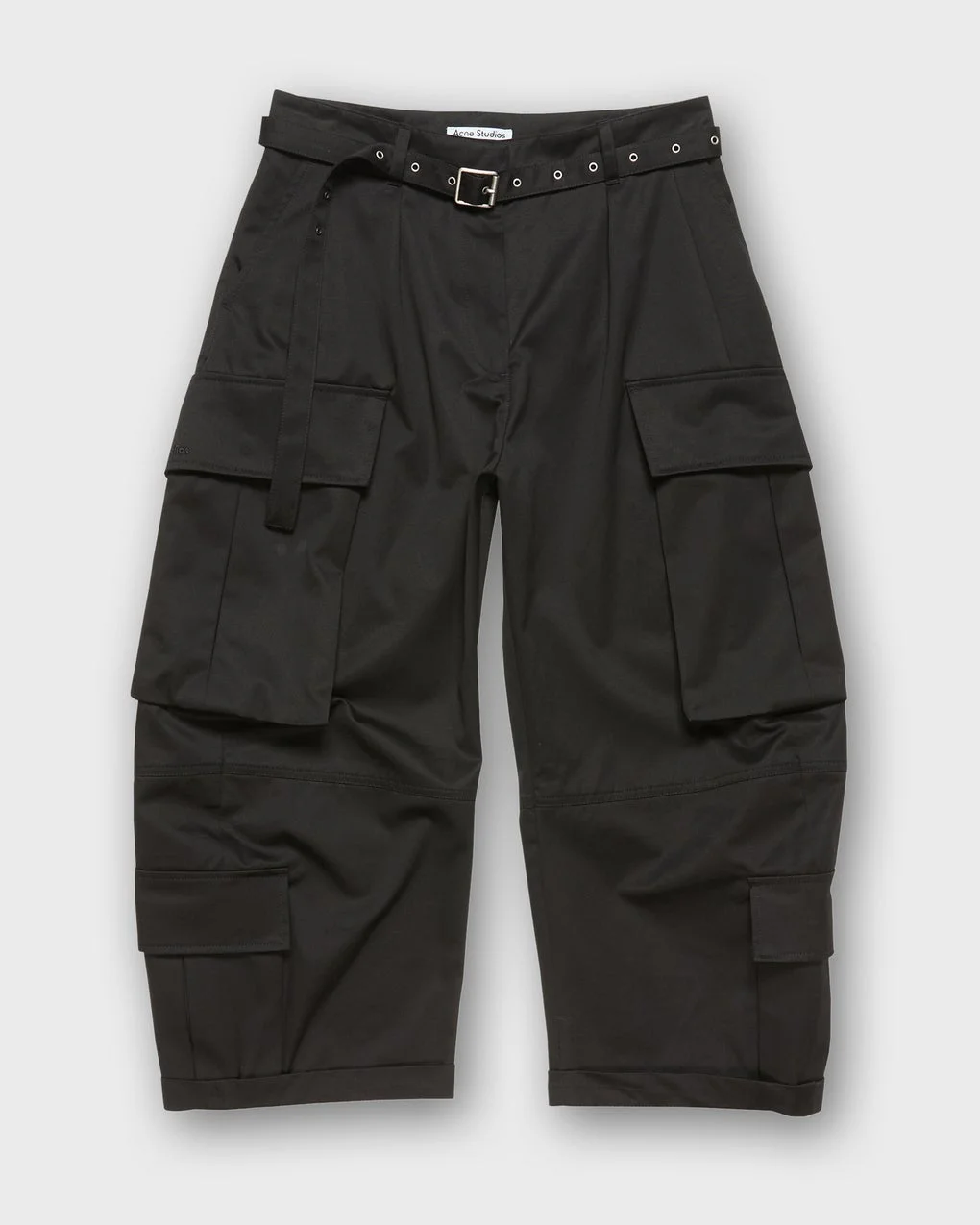 Byxor Belted Cargo by Acne Studios. Trendy cargo trousers in a relaxed fit with oversized pockets and an adjustable belt. Designed with a low waist and a cropped silhouette for an effortless, modern look. Size and Fit - Fits true to size, choose your usual size - The model is 176 cm tall and is wearing size 36 Specification - Article number - ID: 177745-000 - Brand: Acne Studios - Color: Black - Washing Instructions: Hand wash or dry clean - Made of: 100% Cotton