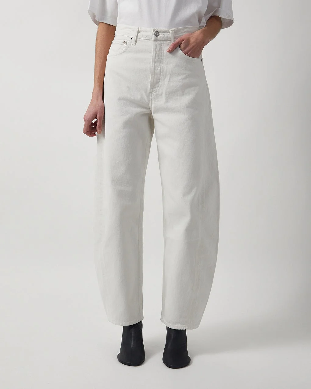 Jeans Luna Pieced H/R CRV Taper from Agolde. The Luna features a waist-defining high-rise fit and a full-length relaxed leg. Pieced insert detailing along the outseam creates a softly bowed silhouette, elevating everyday denim with a refined, fashion-forward edge. Size and Fit - Fits true to size, choose your usual size - The model is 175 cm tall and is wearing size 26 Specification - Article number - ID: 177486-707 - Brand: Agolde - Color: Chalk - Washing Instructions: Machine wash cold inside out - Made of: 100% regenerative cotton