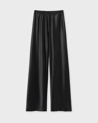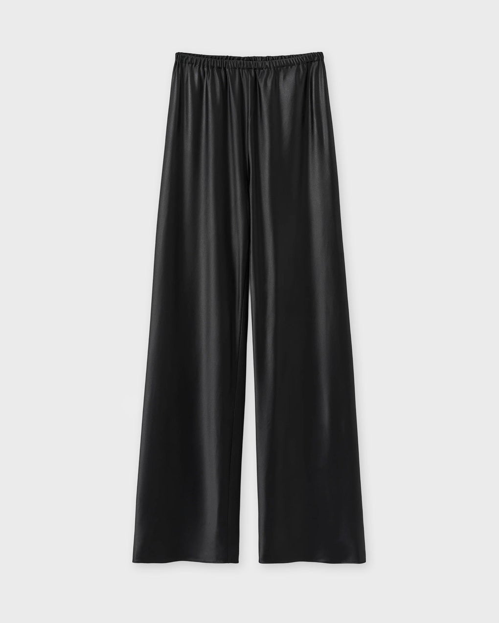 Bias Satin Pants from Almada Label. Elegant trousers made from a luxurious and sustainable fabric composed of 75% Naia™ acetate and 25% polyester. This blend offers a sophisticated and eco-friendly alternative to traditional silk. The material has a naturally silky feel that is comfortable to wear and easy to care for. It wrinkles less than silk and can be machine washed without losing its shine or structure. The pants feature a high waist and a wide-leg fit, complemented by an elastic waistband for added comfort. Size and Fit - The model is 177 cm tall and is wearing size S Specification - Article number - ID: 176897-000 - Brand: Almada Label - Color: Black - Washing Instructions: Hand wash - Made of: 75% Naia ™ Eastman acetate, 25% polyester