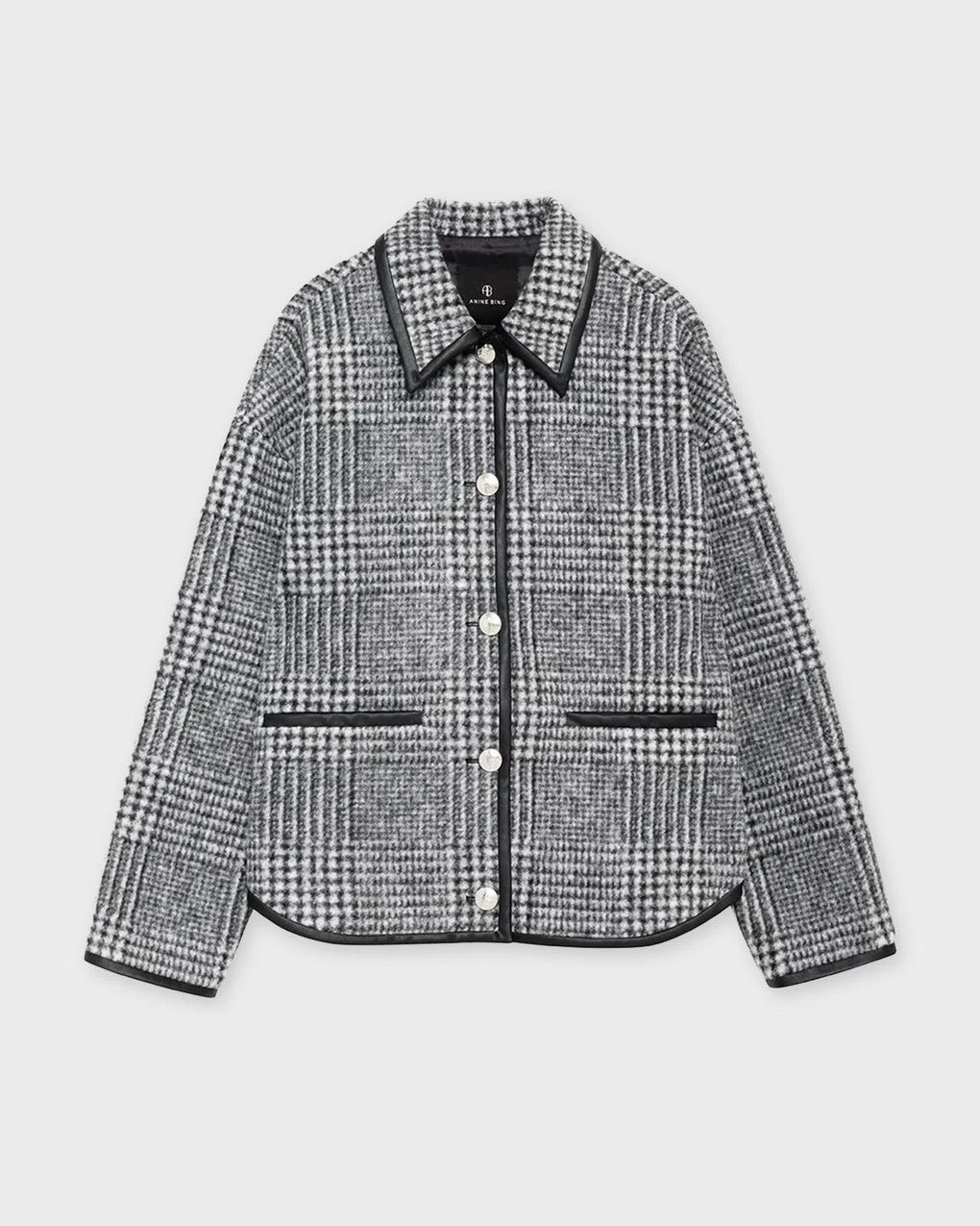 Jacket Camden from Anine Bing. A workwear-inspired jacket crafted from a soft wool blend with a black and grey check fleece pattern. Fully lined and designed in a cropped, boxy silhouette with dropped armholes for a relaxed fit. Finished with faux leather binding and two subtle slit pockets at the hips for a modern, refined look. Size and Fit - Fits true to size, choose your usual size - The model is 175 cm tall and is wearing size S Specification - Article number - ID: 176934-091 - Brand: Anine Bing - Color: Grey - Washing Instructions: Machine wash - Made of: 68% polyester, 32% wool