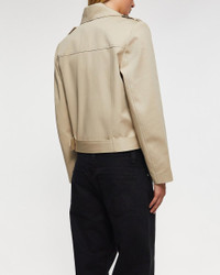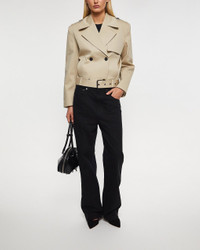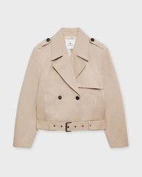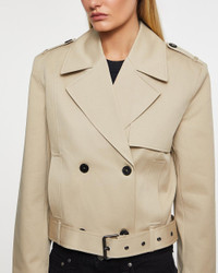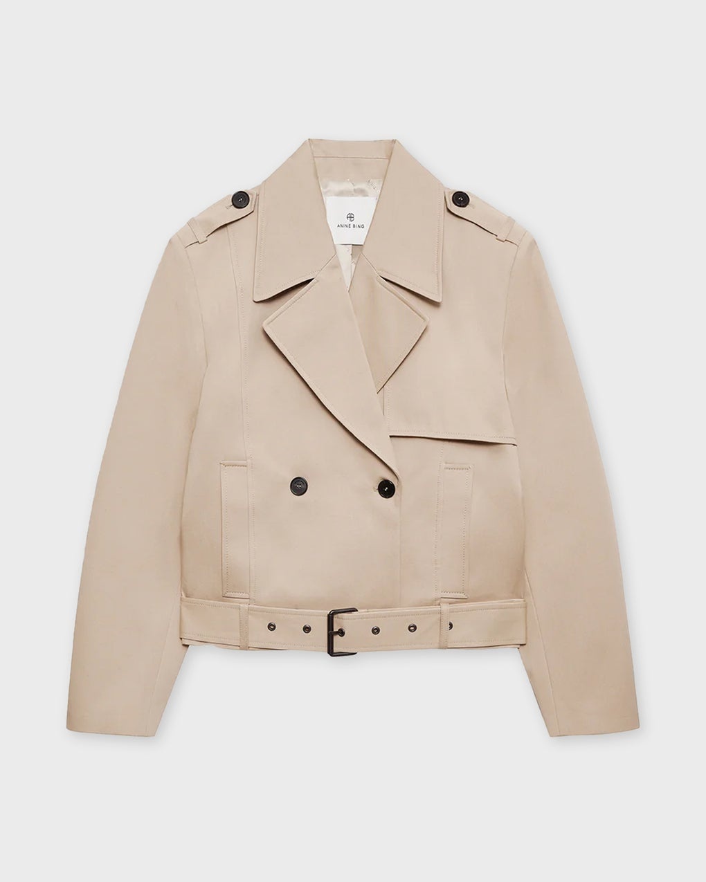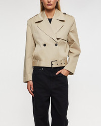 Jacket Greer from Anine Bing. A trench-inspired jacket crafted from lightweight cotton twill with a modern, boxy silhouette. Fully lined with a cropped straight fit for a relaxed yet structured look. Features a double-breasted closure with four horn buttons, wide shoulders with epaulets, and a cinched waist with an adjustable belt to define the shape. Removable shoulder pads add extra structure. Finished with two side welt pockets for practical functionality. Size and Fit - Fits true to size, choose your usual size - The model is 176 cm tall and is wearing size Small Specification - Article number - ID: 176386-073 - Brand: Anine Bing - Color: Taupe - Washing Instructions: Dry clean - Made of: 100% Cotton