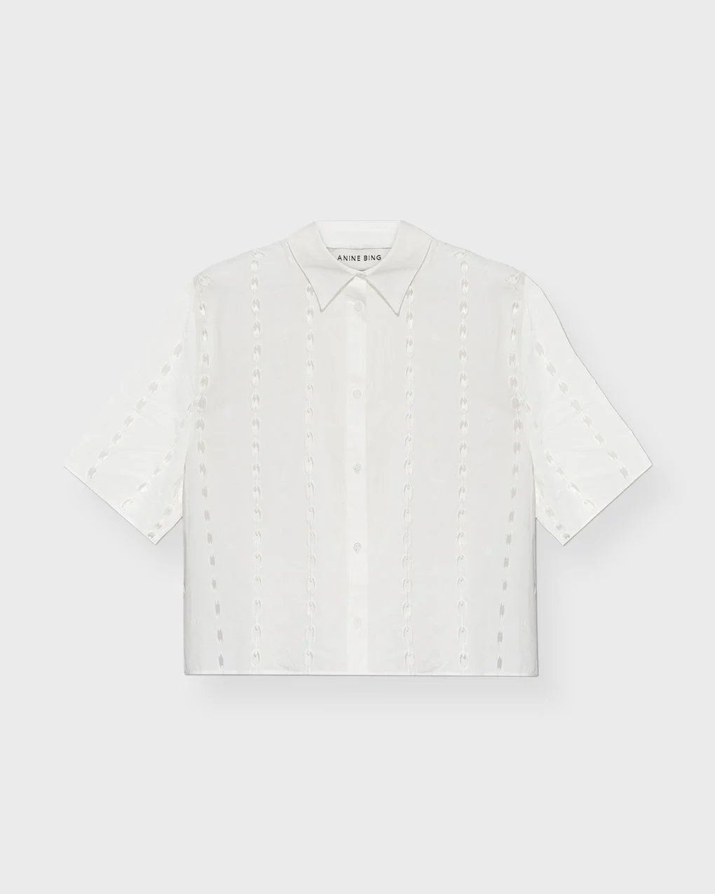 Shirt Lincoln from Anine Bing. A crisp, cropped short-sleeve shirt crafted from lightweight cotton with delicate embroidered cutout detailing. Designed with a boxy silhouette and classic collar, it offers a fresh, modern look that pairs effortlessly with both denim and tailored pieces Size and Fit - Fits true to size, choose your usual size - The model is 175 cm tall and is wearing size S Specification - Article number - ID: 177445-010 - Brand: Anine Bing - Color: White - Washing Instructions: Machine wash - Made of: 100% cotton