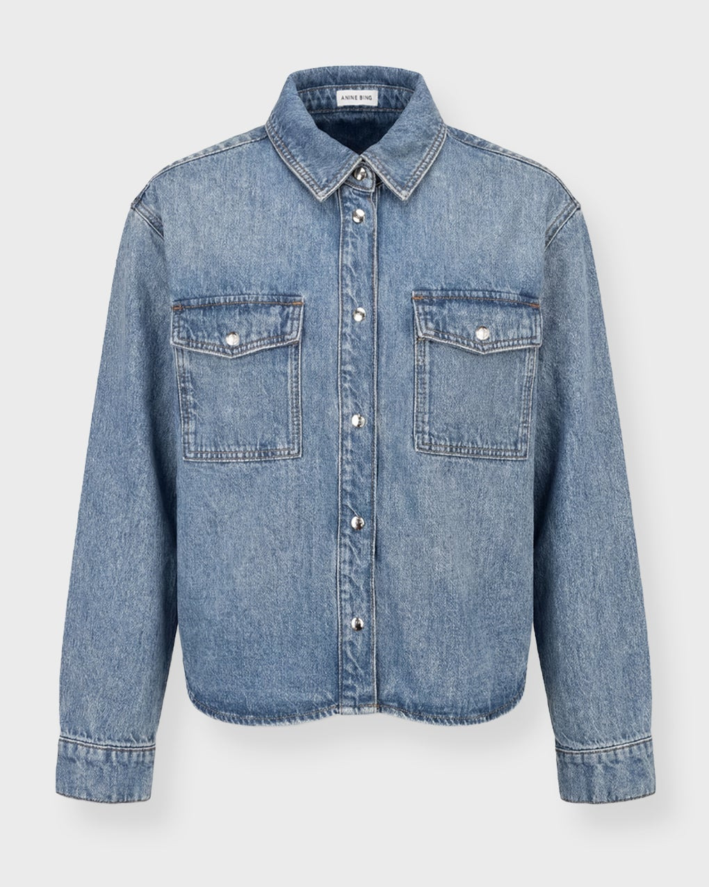 Shirt Paxton from Anine Bing. The Paxton Shirt is crafted from a midweight and rigid cotton denim blend. This modern workwear staple features wide shoulders, two patch pockets at the chest, and a front placket finished with branded snap buttons. Designed with a cropped, boxy silhouette and a pronounced shoulder line for a contemporary, structured look. Size and Fit - Fits true to size, choose your usual size - The model is 175 cm tall and is wearing size S Specification - Article number - ID: 177444-508 - Brand: Anine Bing - Color: Washed blue - Washing Instructions: Machine wash separately - Made of: 100% Regenerative Cotton
