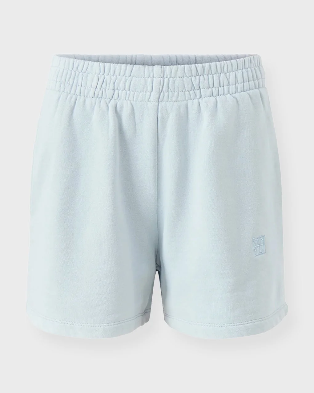 Shorts Kam Framed Monogram from Anine Bing. The shorts feature a light blue elastic waistband with a subtle, visible logo detail. A clean, easy-to-wear design made for relaxed everyday styling, offering a short silhouette and a soft, comfortable fit. Size and Fit - Fits true to size, choose your usual size - The model is 175 cm tall and is wearing size S Specification - Article number - ID: 177440-020 - Brand: Anine Bing - Color: Light blue - Washing Instructions: Machine Wash - Made of: 100% cotton