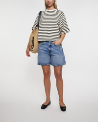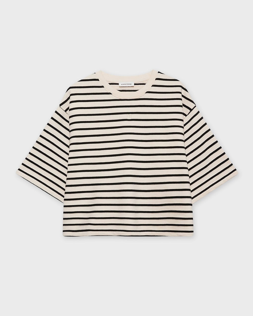 T-Shirt Myers Cropped by Anine Bing. Trendy cropped tee made from midweight cotton French terry featuring classic black and white Breton stripes. It has an oversized, relaxed fit, a cropped hem, and an embroidered framed monogram on the chest. Size and Fit - Fits true to size, choose your usual size - The model is 176 cm tall and is wearing size Small Specification - Article number - ID: 176394-345 - Brand: Anine Bing - Color: Vit/svart - Washing Instructions: Machine wash - Made of: 83% Cotton, 17% Polyester
