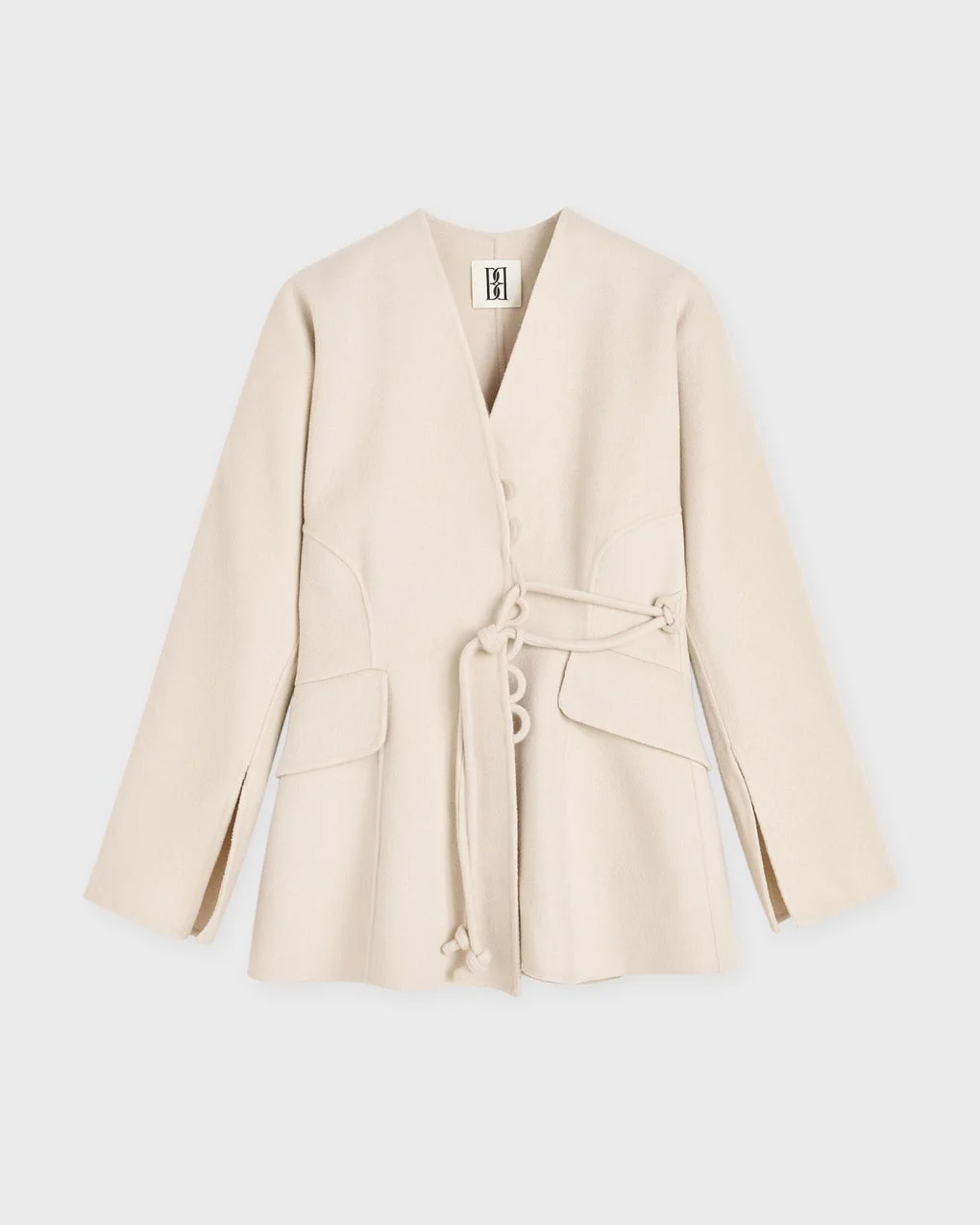 Blazer Lalou from By Malene Birger. The Lalou blazer offers a feminine, warm reinterpretation of a classic silhouette. Crafted from elegant felted wool, it features a wrap design with an adjustable tie closure that allows for versatile styling. Deep slits at the sleeves add a refined, modern touch. Size and Fit - Fits true to size, choose your usual size - The model is 176 cm tall and is wearing size 36 Specification - Article number - ID: 177347-081 - Brand: By Malene Birger - Color: Cream - Washing Instructions: Dry clean - Made of: 100% Wool