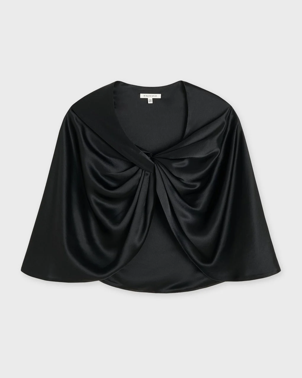 Cape Pinlos from By Malene Birger. A bohemian and elegant cape in lustrous satin, perfect as a stylish layer for seasonal occasions. It features a fringed hem and can be worn centered or draped over one shoulder depending on your outfit. Made from Eastman Naia™ – a cellulosic fiber derived from responsibly sourced wood pulp that is quick-drying, biodegradable, and exceptionally soft. Size and Fit - Fits true to size, choose your usual size Specification - Article number - ID: 176071-000 - Brand: By Malene Birger - Color: Black - Washing Instructions: Machine wash - Made of: 85% acetate, 15% polyester