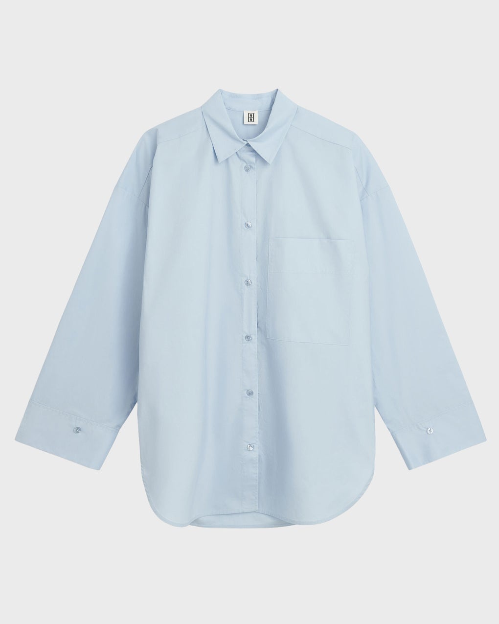 *Derris shirt from By Malenen Birger. A classic shirt made in organic cotton. The shirt has a classic collar with a rounded hem. Decorative buttons at the front and at the cuffs. Designed in a slightly oversized fit and it has a decorative patch pocket on one chest. Style with jeans and a heel for a complete look. Size and Fit - Fits true to size, choose your usual size - The model is 177 cm tall and is wearing a size 36 Specification - Article number - ID: 171336-022 - Brand: By Malene Birger - Color: Blue - Washing Instructions: Machine wash - Made of: Made of 100% organic cotton