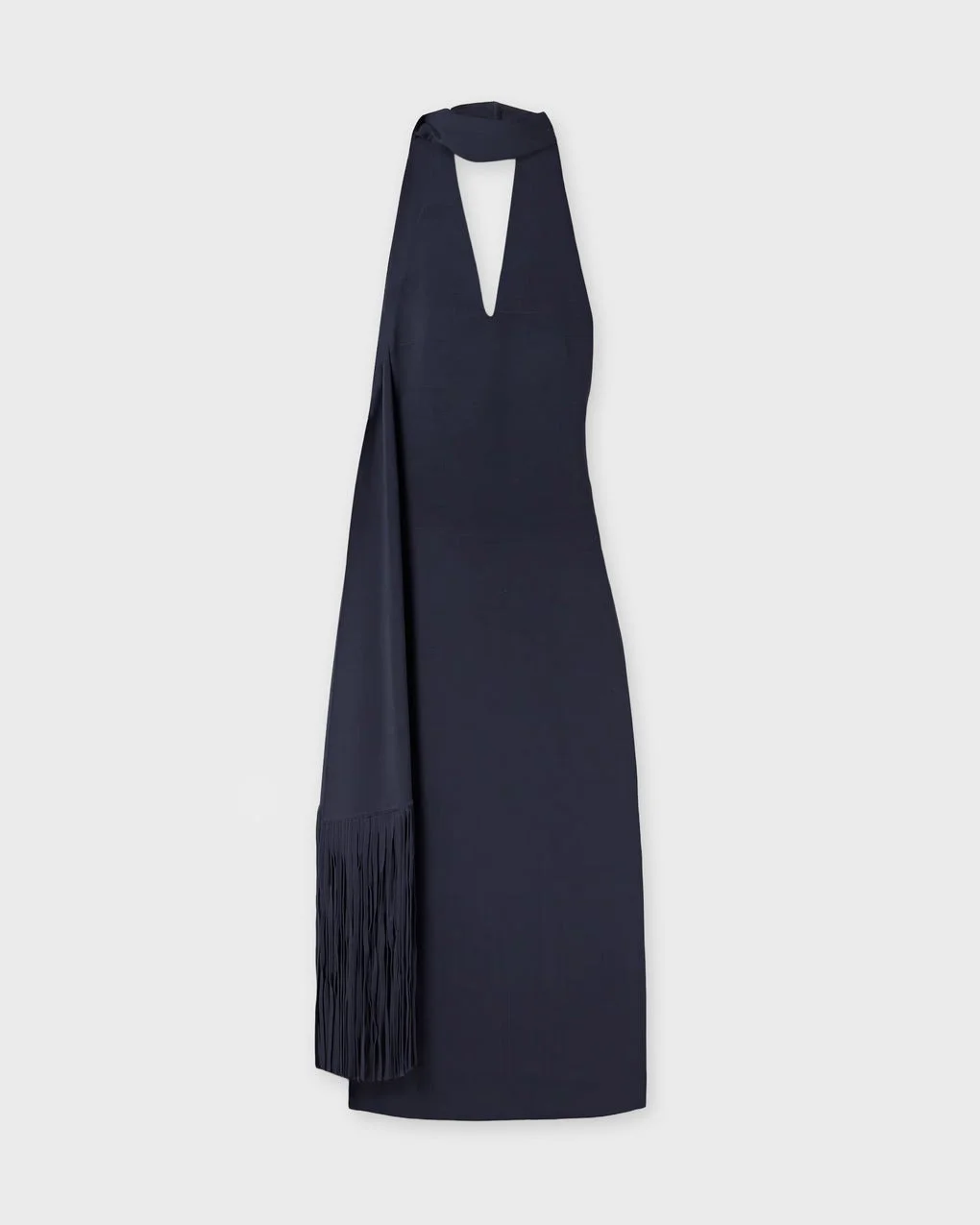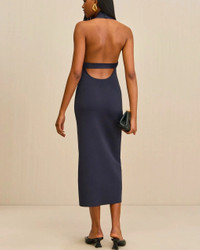 Caia Knit Dress by Cult Gaia. An elegant and timeless midi dress with a sleek silhouette and modern details. The dress features an open back for a sophisticated look, along with a removable scarf that can be styled in multiple ways around the neck or draped for a more relaxed feel. With its flattering midi length, it’s the perfect choice for both parties and dinner occasions. Size and Fit - Fits true to size, choose your usual size Specification - Article number - ID: 177016-022 - Brand: Cult Gaia - Color: Blue - Washing Instructions: Machine wash - Made of: 60% Viscose, 40% Nylon
