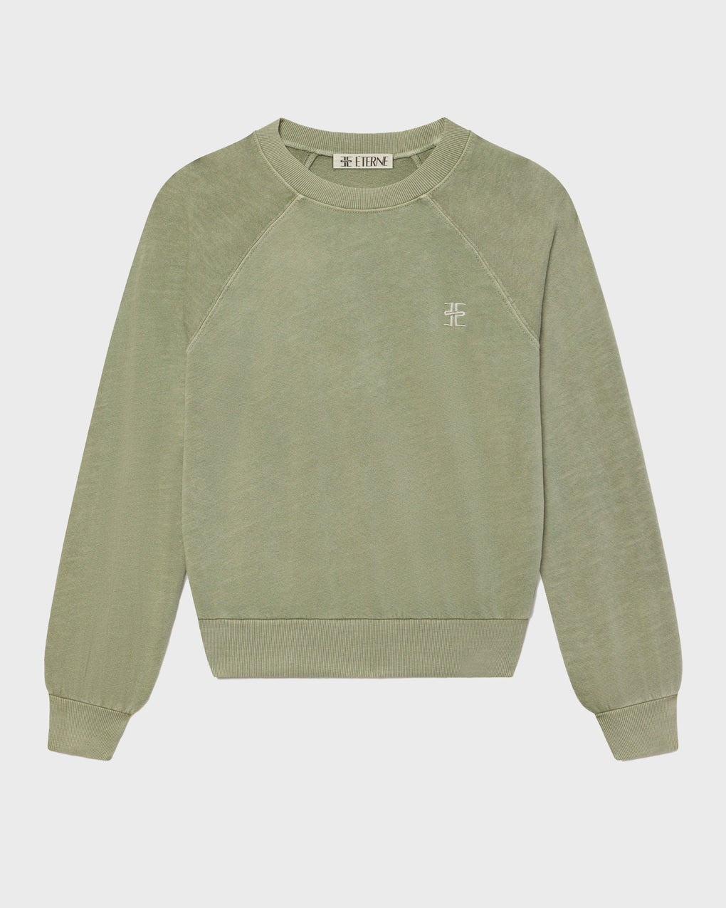 Sweatshirt Shrunken Raglan from Eterne. A sleek sweatshirt in lightweight French terry. With its cropped length, slim fit, and raglan sleeves, it offers both comfort and a modern silhouette. Made from 100% cotton and garment-dyed using an artisanal technique that makes each piece unique. Perfect for everyday wear or a relaxed look. Size and Fit - Fits true to size, choose your usual size Specification - Article number - ID: 175867-872 - Brand: Eterne - Color: Sage - Washing Instructions: Machine wash - Made of: 100% Cotton