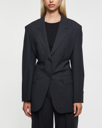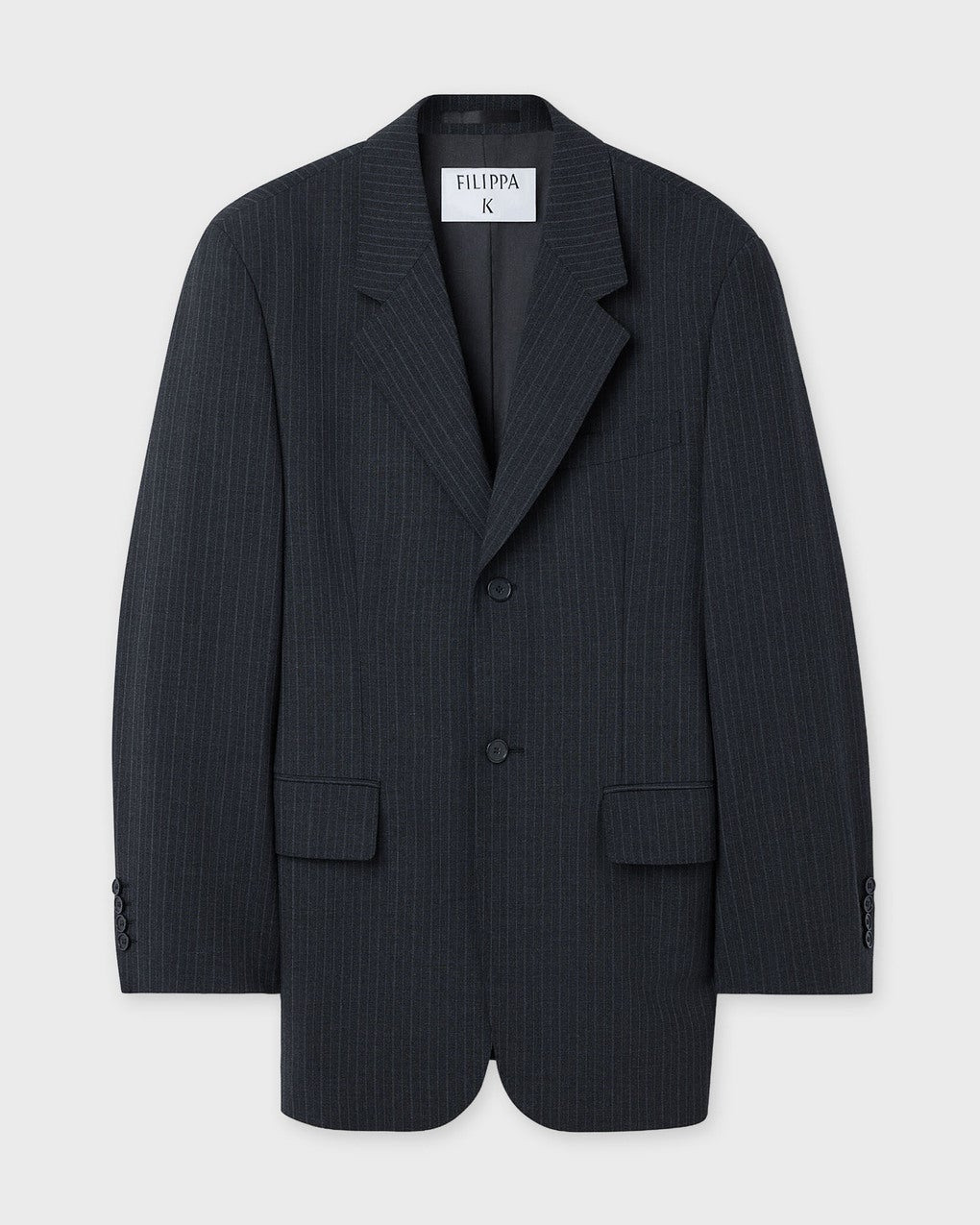 Blazer Hourglass Pinstripe from Filippa K. The Hourglass Pinstripe Blazer is designed with padded shoulders, extra-long sleeves, and a fitted waist, creating our signature hourglass silhouette. Made from a medium-weight wool blend with slight stretch. Wear it with the Darcey Pinstripe Trousers for a complete suit look. Size and Fit - Fits true to size, choose your usual size - The model is 176 cm tall and is wearing size 36 Specification - Article number - ID: 176846-099 - Brand: Filippa K - Color: Anthracite - Washing Instructions: Dry clean - Made of: 60% Wool (mulesing free merino), 38% Polyester (chem. recycled), 2% Elastane