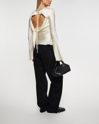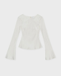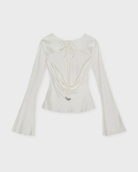 Blouse Solid Stretch Satin Long Sleeve from Ganni. This blouse features a round neckline, long sleeves, an open back, and tie bands with a silver-colored GANNI Butterfly logo. Designed for a slim fit. Size and Fit - Fits true to size, choose your usual size - The models is 176 cm tall and is wearing size 36 Specification - Article number - ID: 176174-517 - Brand: Ganni - Color: Egret - Washing Instructions: Machine wash cold - Made of: 96% viscose, 4% elastane
