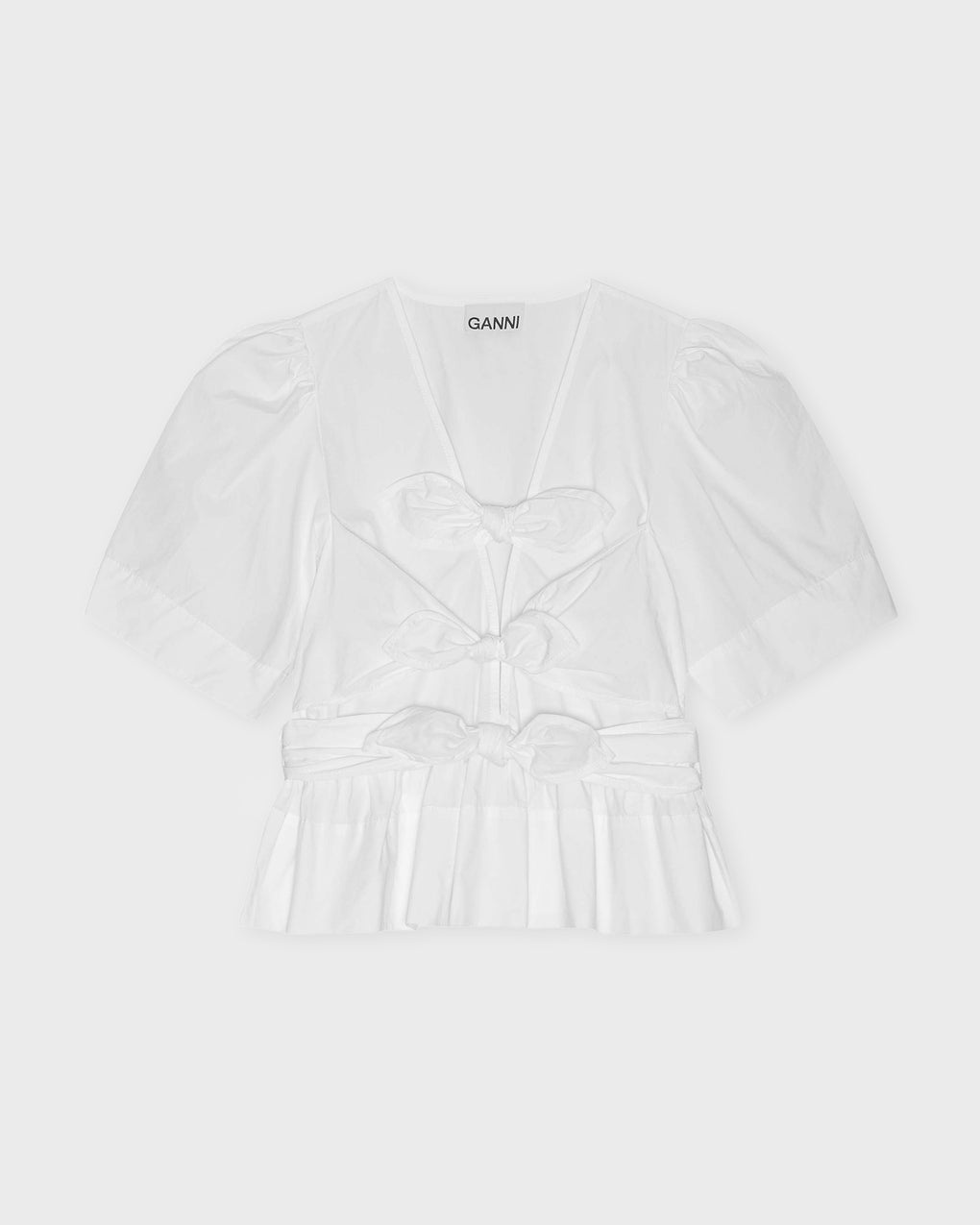 Blouse Washed Stretch Cotton Strap from GANNI. This white-washed tie blouse in stretchy cotton features a deep V-neckline, three front tie closures, and short puff sleeves. Made from cotton and elastane. Size and Fit - Fits true to size, choose your usual size - The model is 176 cm tall and is wearing size 36 Specification - Article number - ID: 175645-010 - Brand: Ganni - Color: White - Washing Instructions: Machine wash - Made of: 97% cotton, 3% elastane