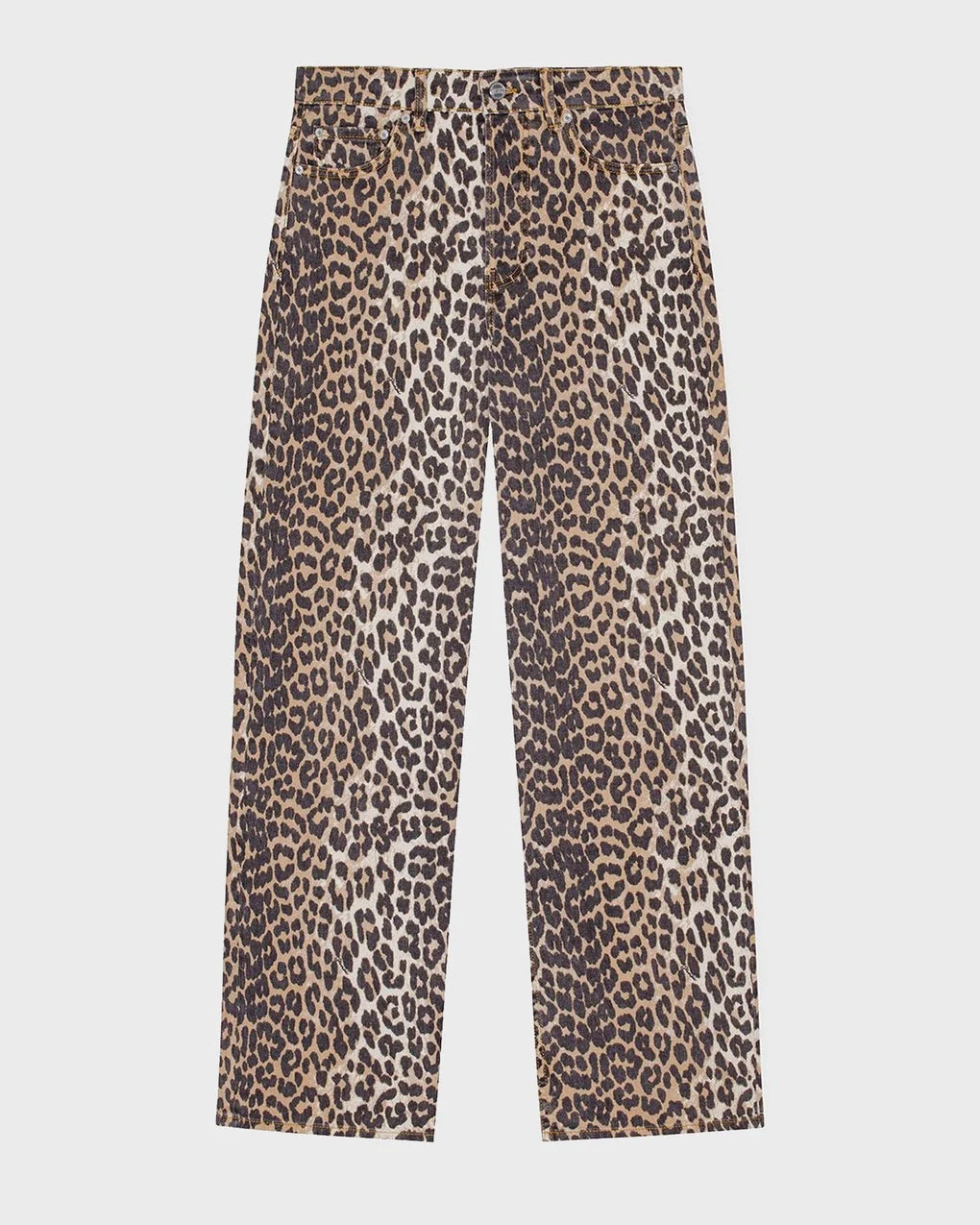 Print Denim Izey Leopard Jeans from Ganni. Trendy jeans designed with a leopard print. The jeans feature straight legs and a high waist. Detailed with belt loops at the waist, side pockets, and back pockets. Fastened with a button and zipper. Size and Fit - Fits true to size, choose your usual size - The model is 176 cm tall and is wearing size 26 Specification - Article number - ID: 174365-259 - Brand: Ganni - Color: Leopard - Washing Instructions: Machine wash - Made of: 99% cotton, 1% elastane