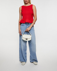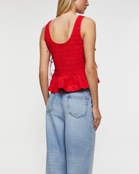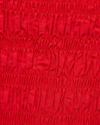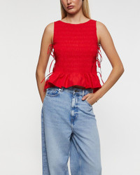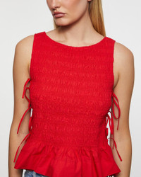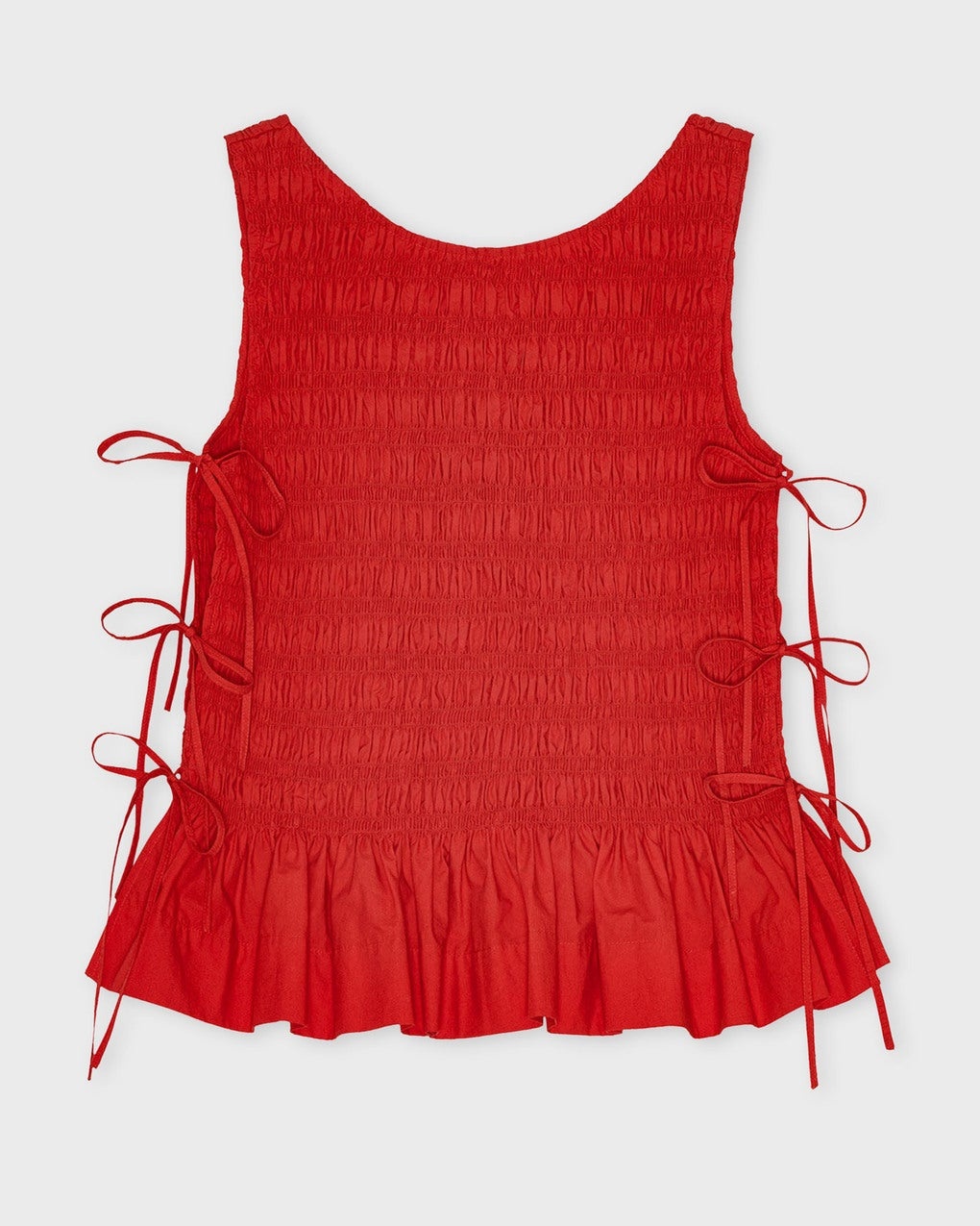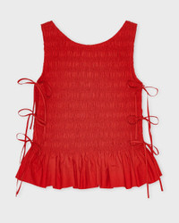 Top Cotton Poplin Smock Tie String by Ganni. This sleeveless top features a smocked texture, tie details along the sides, a deep back, and a ruffle hem. The product belongs to the W Sustain category as it is made from sustainable materials. Size and Fit - Fits true to size, choose your usual size - The model is 172 cm tall and is wearing size 36 Specification - Article number - ID: 176176-040 - Brand: Ganni - Color: Red - Washing Instructions: Machine wash - Made of: 100% Organic cotton