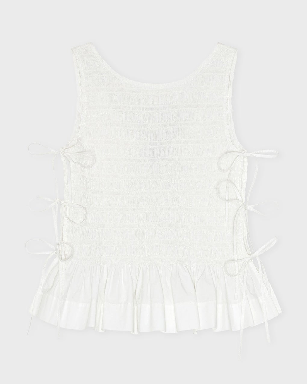 Top Cotton Poplin Smock Tie String by Ganni. This sleeveless top features a smocked texture, tie details along the sides, a deep back, and a ruffle hem. The product belongs to the W Sustain category as it is made from sustainable materials. Size and Fit - Fits true to size, choose your usual size - The model is 172 cm tall and is wearing size 36 Specification - Article number - ID: 176175-010 - Brand: Ganni - Color: White - Washing Instructions: Machine wash - Made of: 100% Organic cotton