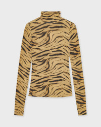 Top Printed Shiny Jersey Turtleneck from GANNI. Turtleneck top with tiger print and high collar. Made from stretchy material with long sleeves and a slim fit. Size and Fit - Fits true to size, choose your usual size - The model is 177 cm tall and is wearing size 36 Specification - Article number - ID: 176557-033 - Brand: Ganni - Color: Khaki - Washing Instructions: Machine wash - Made of: 95% viscose, 5% elastane