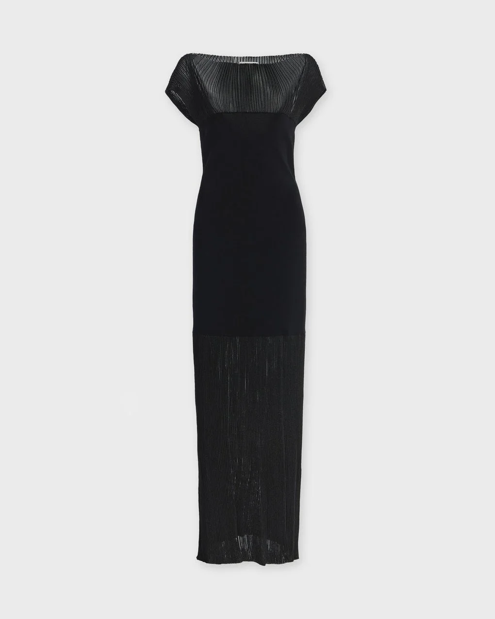 Dress Contrast Knit from Dagmar. A full-length knit dress featuring a sculpted waist and sheer, lustrous ribbed tiers that create a refined textural shift. The silhouette flows gracefully, offering an elegant, dimensional look with subtle transparency and feminine movement. Size and Fit - Fits true to size, choose your usual size - The model is 175 cm tall and is wearing size S Specification - Article number - ID: 177972-000 - Brand: Dagmar - Color: Black - Washing Instructions: Dry Clean - Made of: 63% Viscose, 37% Nylon
