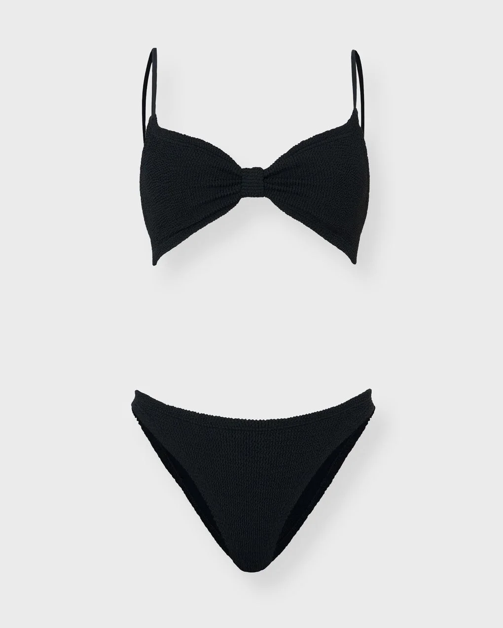Bikini Alicia from Hunza. A sweet and effortless bikini with feminine details. The top features delicate spaghetti straps and gathered bow-effect accents for a playful and elegant touch. The bikini is one size and adapts to the body for a flexible fit, perfect for sunny days by the beach or pool. Specification - Article number - ID: 178424-000 - Brand: Hunza - Color: Black - Washing Instructions: Machine wash - Made of: 97% Polyamide, 3% Elastane - Color: Black
