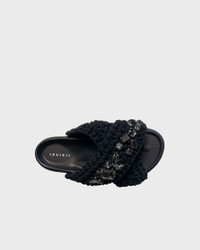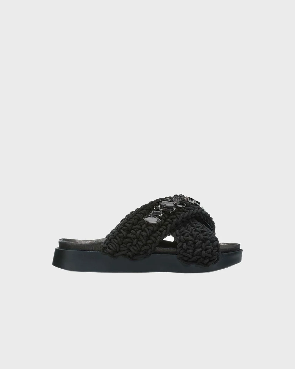 *Woven Stone Slipper by Inuikii. Trendy slip-in sandals in a crocheted design. The sandals have decorative stones in different shades and sizes at the front. Raised sole. Handmade in Europe. Size and Fit - Fits true to size, choose your usual size Specification - Article number - ID: 172359-000 - Brand: Inuikii - Color: Black