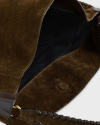 Bag Oskan Hobo Soft by Isabel Marant. The Oskan Hobo Soft is a bohemian yet elegant shoulder bag crafted from braided suede calfskin leather. It can be carried by hand or worn on the shoulder with its soft leather handle. The edges are adorned with supple braided leather details, and engraved metal rings add a touch of refinement. The bag features a magnetic closure and includes a removable zippered pouch with a studded button. Embossed "Isabel Marant" logos complete the signature look. Measurements: 36 x 42 x 6 cm. Size and Fit - 36 x 42 x 6 cm Specification - Article number - ID: 176303-102 - Brand: Isabel Marant - Color: Bronze