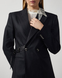 Blazer Nahia from Isabel Marant. Tailored suit jacket in a striped virgin wool blend with seamless stripe detailing for an elegant finish. Features a lapel collar, long sleeves, and a double-breasted front with a removable belt adorned with eyelets. Designed with a chest pocket, piped side pockets, and an inside pocket. The straight cut offers a timeless and sophisticated silhouette – perfect to pair with the matching Noanne trousers for a complete suit look. Size and Fit - Fits true to size, choose your usual size - The model is 172 cm tall and is wearing size FR 38 Specification - Article number - ID: 176301-000 - Brand: Isabel Marant - Color: Black - Washing Instructions: Dry clean - Made of: 84% virgin wool, 16% polyester
