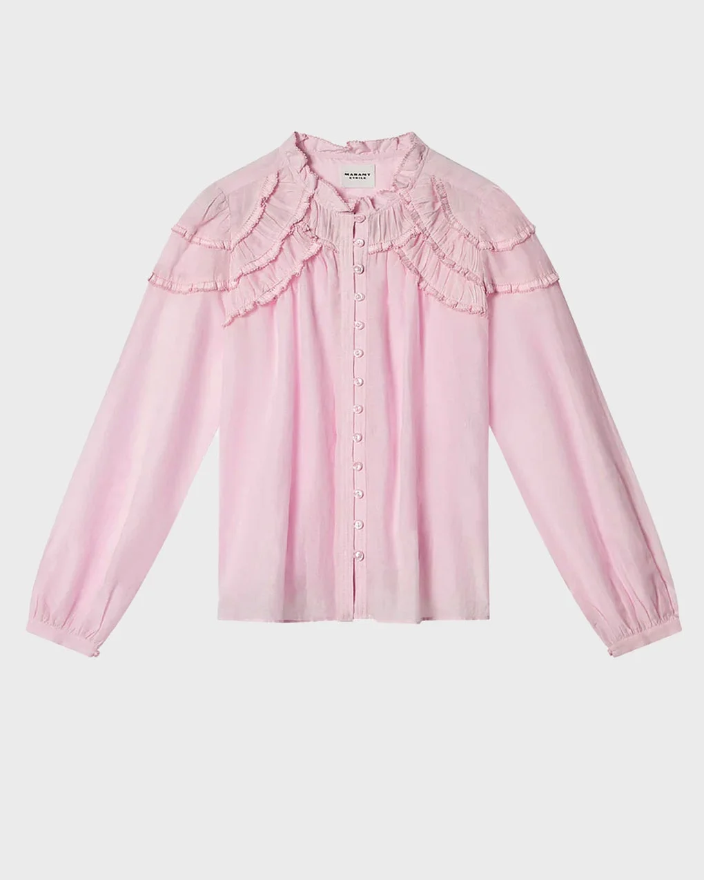 Blouse Christa from Isabel Marant Etoile. A romantic, feminine blouse in a light semi-sheer fabric, finished with layered ruffles across the shoulders. The high neckline and button-front design create an elegant silhouette, while the softly voluminous sleeves add a breezy, effortless feel. A dreamy piece that elevates denim just as beautifully as skirts — perfect from day to dinner. Size and Fit - Fits true to size, choose your usual size - The model si 173 cm tall and is wearing size FR 38 Specification - Article number - ID: 177573-060 - Brand: Isabel Marant Etoile - Color: Light pink - Washing Instructions: Dry clean - Made of: 80% cotton, 20% viscose