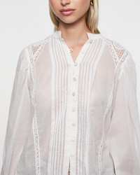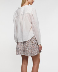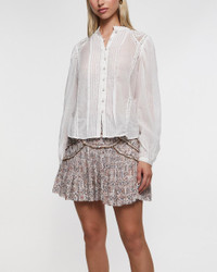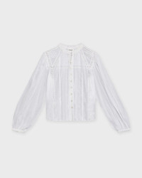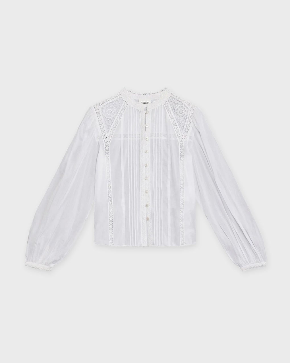 Blouse Greicy by Isabel Marant Etoile. The Greicy blouse is a sophisticated piece in cotton voile, adorned with romantic lace details for a feminine touch. It features a round neckline with lace trim, openwork lace yokes at the shoulders, and a buttoned front. The long sleeves are finished with slim buttoned cuffs, and the straight cut lends a timeless silhouette. A refined blouse that pairs effortlessly with both jeans and skirts. Size and Fit - Fits true to size, choose your usual size - The model is 176 cm tall and is wearing size 36 Specification - Article number - ID: 176321-010 - Brand: Isabel Marant Etoile - Color: White - Washing Instructions: Dry clean - Made of: 100% cotton