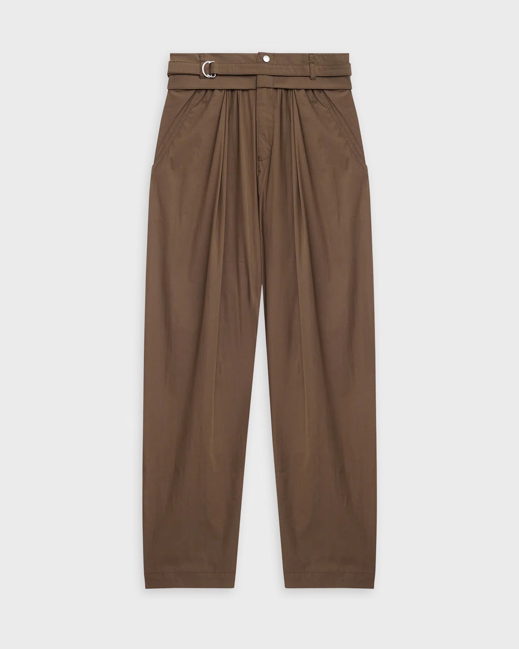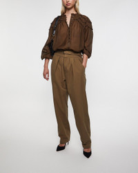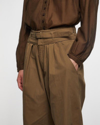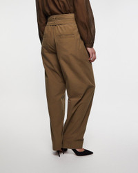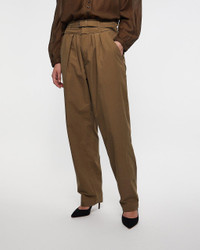 Celia Trousers by Isabel Marant. The Celia trousers are relaxed tailored pants made from an organic cotton blend with a slightly tapered leg. The detachable waist belt offers an adjustable and modern silhouette, while the pleated front adds volume and character. This style features two slanted side pockets, two welt pockets at the back, belt loops, and a discreet zip fly with a press-stud closure. The product is under the W Sustain category as it is made of sustainable materials. Size and Fit - Fits true to size, choose your usual size - The model is 176 cm tall and is wearing size FR 38 Specification - Article number - ID: 176314-033 - Brand: Isabel Marant Etoile - Color: Khaki - Washing Instructions: Machine wash - Made of: Organic Cotton 80%, Recycled Polyamide 20%